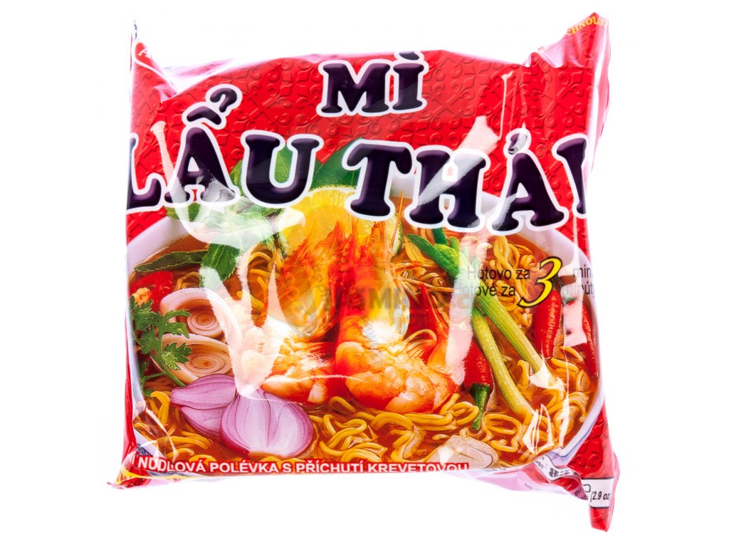 - Složení: Nudle (77.9%): pšeničná mouka, částečně ztužený rostlinný palmový olej, škrob, sůl, cukr, rybí extract (sardele), stabilizátor: E451i, kypřící látka: E501, E500, antioxidant: E 320), antioxodant: E 321, zvýrazňovač chuti: E 621. Polévka (9.2%): Cukr, sůl, zvýrazňovač chuti: E 621, E 631,E 627, koření, rybí prášek (sardele), krevetový prášek (0,3%), kyselina citronová: E330. Olej (3.9%): rostlinný palmový olej, antioxidant: E 320, E 321, koření, sůl, umělá citronová příchuť, kyselina citronová: E330, cukr. Mix (1.4%): Sušené krevety 0.6%, sušená šalotka, sušená jarní cibulka, sušený koriandr pilovitý. Pasta (7.6%): tamarind, sůl, cukr, kyselina citronová: E330. Alergeny: Pšenice, ryby, sója, korýši. Nutriční hodnoty na 80g: Energie 1440 kJ / 343 kcal / Tuk 13,1g z toho nasycené mastné kyseliny 7,7g / Sachardiy 47,8g z toho cukr 9,3g / Protein 7,2g / Sůl 4,8g. Datum spotřeby: 5 měsíců od data výroby. Skladování: Skladujte v suchu a před slunečním zářením. Země původu: Vietnam.Doplňkové parametry
