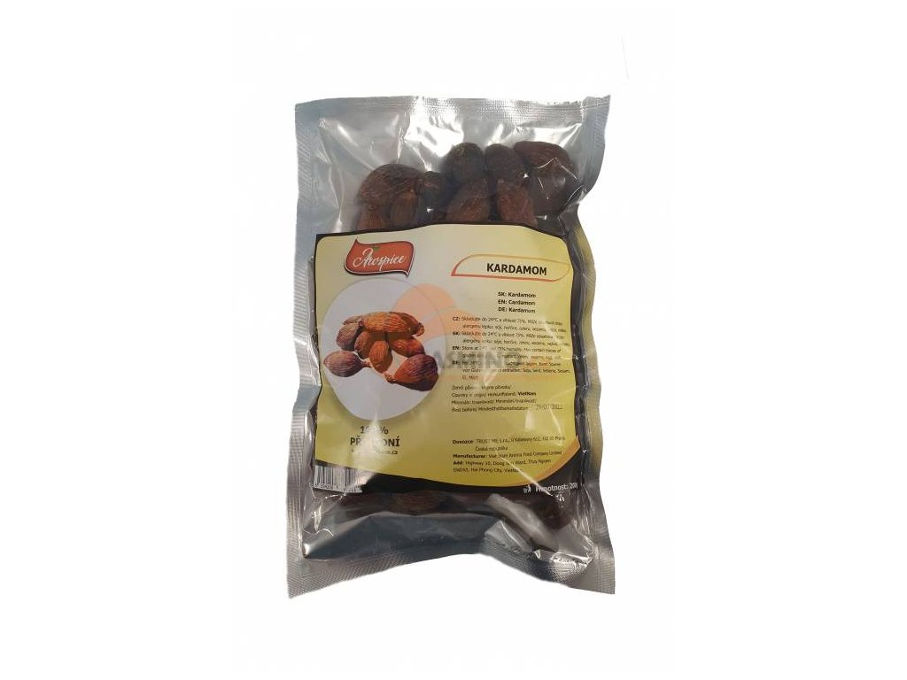 - Koření černý kardamom je podobný zelenému, ale jeho chuť je těžší s příměsí kouřového aroma. Černý kardamom můžete použít do polévek, marinád, k masu apod. Hodně se používá na způsob slaniny. Složení: jednodruhové koření Černý kardamom. Skladování :Skladujte v suchu a chladu. Země původu : Vietnam.Doplňkové parametry