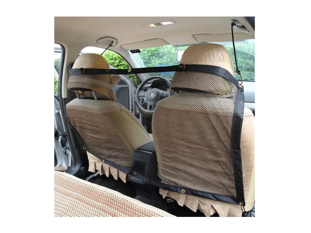 Černá elastická dělicí síť do auta k vymezení prostoru určeného pro psa od prostoru pro pasažéry vozu.