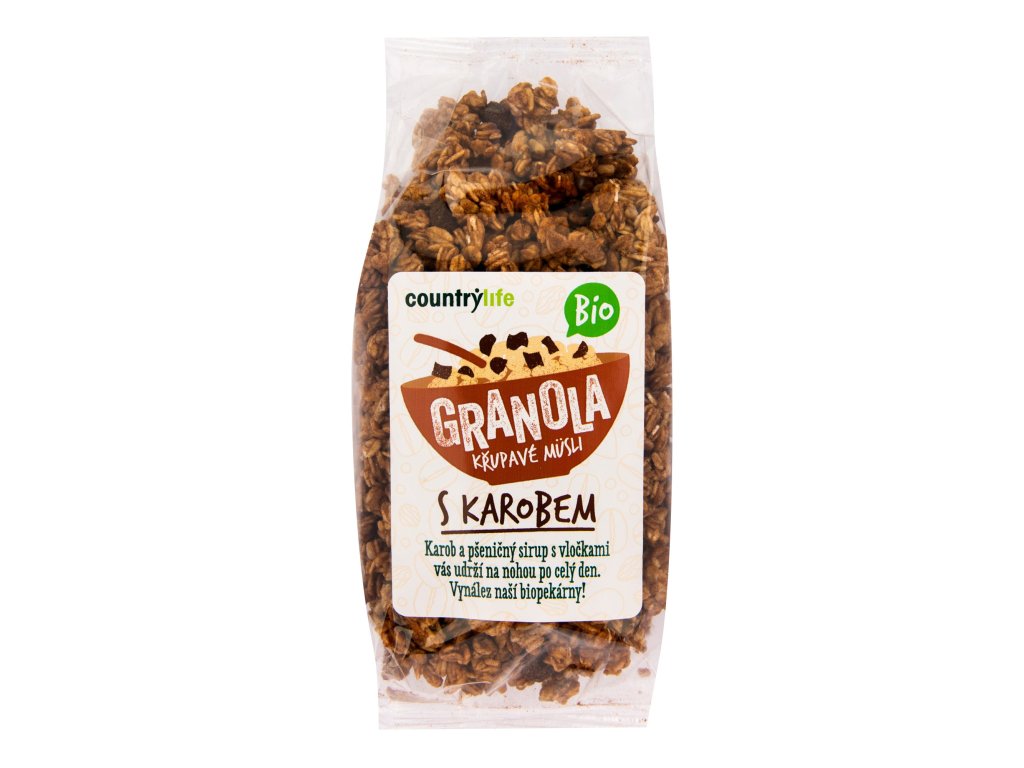 Podrobná specifikace: | <!-- Generated by XStandard version 2.0.0.0 on 2020-04-15T14:50:24 --><p>Karob a pšeničný sirup s vločkami vás udrží na nohou po celý den. Vynález naší pekárny!</p><p>Křupavé müsli s karobem doslazené kapkou pšeničného sirupu. Je vynikající na snídani s rostlinným mlékem a spoustou čerstvého ovoce, na malou svačinku nebo k mlsání v průběhu dne. Můžete si s ním také posypat ovocný salát nebo smoothie bowl. Granola bude chutnat určitě celé rodině. Můžete s ní i dozdobit dezerty, různě ji vrstvit na příklad s pudingem či jogurtem.</p><p><strong>Využití:</strong></p><ul><li>snídaně - zalijte granolu mlékem nebo rostlinným nápojem a máte rychlou a chutnou snídani, lze použít i jogurt nebo sójový dezert</li><li>cranachan - recept najdete v časopise <a href="https://issuu.com/countrylife.cz/docs/casopis_dobroty06_zima2013-14_web?e=26874338/42878872">Dobroty zima 2013-14</a> na str. 17</li></ul><p>Karob (svatojánský chléb) je chutnou alternativou kakaa. Pochází ze stromu s názvem rohovník obecný, který roste hlavně na Středním východě. Zde se pěstuje už nejméně 4 000 let. Vzhledem k přirozeně nasládlé chuti nevyžaduje karob obohacení cukrem. Díky jemné konzistenci není třeba ani přidávat velké množství tuku, což je při výrobě čokolády běžné.</p><p>Biopotraviny vždy prochází systémem kontrol a certifikace, který zajišťuje jejich kvalitu a umožňuje jim nést toto označení. Jejich biokvalitu docení především lidé se zájmem o ekologické zemědělství a udržitelný systém hospodaření.<br /><br />Zajímá vás více o ekologickém zemědělství? Přečtěte si články v našem <a href="https://www.countrylife.cz/bioserial">bioseriálu</a>.</p> |