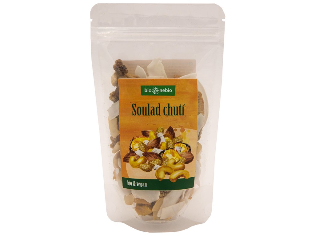 BIO směs Soulad chutí je vyvážená kombinace křupavých oříšků, sladkého ovoce a výživných semínek. Skvělá do smoothie, jogurtů, kaší, pečiva nebo jen tak samotná. 100% přírodní produkt.