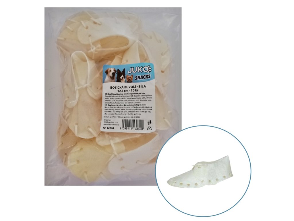 Velmi oblíbený žvýkací pamlsek z bělené buvolí kůže ve tvaru botičky. Vhodný i pro štěňata.