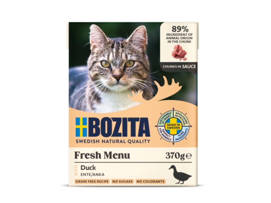 Bozita kousky v omáčce s kachnou je chutné kompletní mokré krmivo pro dospělé kočky, připravené z vysoce kvalitních surovin a 89 % složek živočišného původu v kouscích.