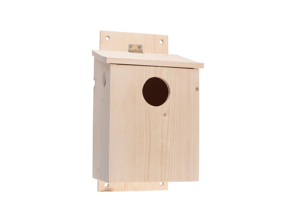 Venkovní dřevěná budka s odklápěcí střechou je vhodná pro hnízdění špačků, velkých druhů sýkor, strakapoudy, brhlíky, rehky.