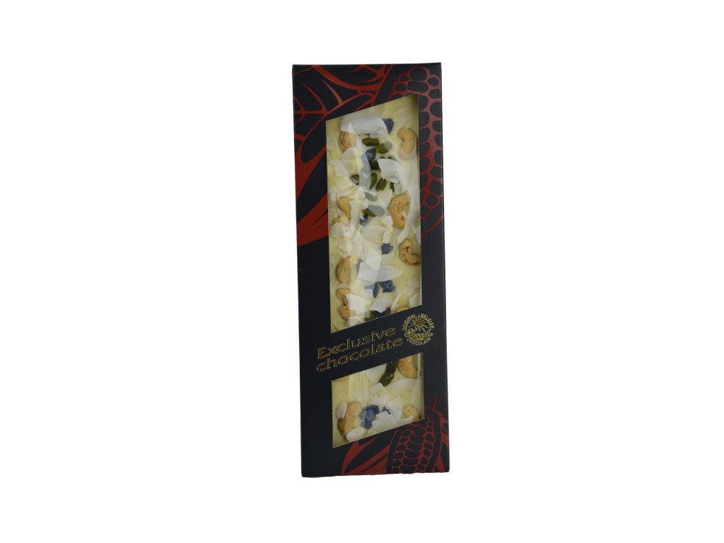 Čokoláda bílá s kešu oříšky, pistáciemi, fialkami a kokosem - Severka 135g
