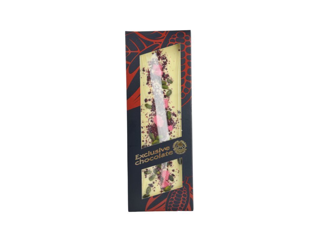 Čokoláda bílá s pistáciemi, růžemi a višněmi - Severka 115g