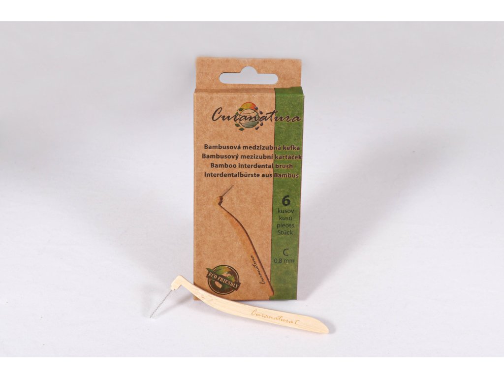 Plaku a zbytků potravin ze širších mezizubních prostor se snadno zbavíte pomocí Curanatura C 0,8. Mezizubní kartáčky mají prodlouženou rukojeť z bambusu, která usnadní čištění i hůře dostupných míst v ústech. Jemná nylonová vlákna jsou šetrná k zubům i dásním.- Pro odstranění plaku a zbytků potravin z širších mezizubních prostor- Ultra jemná nylonová vlákna šetrně čistí- Prodlouženou bambusovou rukojeť lze ekologicky zklikvidovat- Používejte denně pro zdravé zuby a dásněKartáčky CURANATURA, jako jedny z mála kartáčků na trhu, splňují všechny standardy stanovené Světovým symposiem dentální hygieny pro zdravý a vyhovující zubní kartáček, jsou vyrobeny bez použití zbytečných plastů = bez ftalátů a BPA. Na odborné rady dentálních hygieniků je kartáček osazen měkkými jemnými štětinkami, které jsou šetrné k Vašim zubům i dásním. Zároveň je to ta nejlepší volba pro životní prostředí. Zubní kartáčky CURANATURA jsou 100 % BIOLOGICKY ODBOURATELNÉ, balené jsou v recyklovaném papíře, takže po výrobku nezbývá žádný dlouhodobý odpad. Při designování a výrobě vždy hledíme na kvalitu, a proto je rukojeť vyrobena z kvalitního přírodního materiálu - tepelně upravený bambus - pěstován bez pesticidů shromažďován s ohledem na dlouhodobě udržitelnou produkci.Složení: