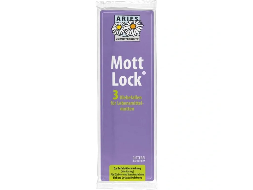 Lebensmittelmottenfallen zur Überwachung des Befalls. Diese ungiftigen Klebefallen sind nach dem Entfernen der Schutzfolie sofort einsatzbereit. Lockstoffe (Pheromone) ziehen paarungswillige Männchen an, die sich an der klebrigen Oberfläche festsetzen und Aufschluss über die Stärke des Befalls geben.