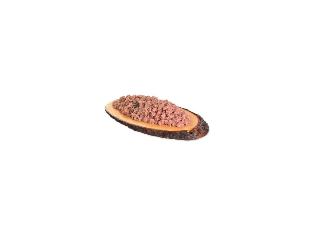 85 % Fleisch und Innereien (59 % Pute, 26 % Lachs), 9 % Brühe, 4 % Heidelbeeren, 1 % Mineralstoffe, 1 % Leinöl.