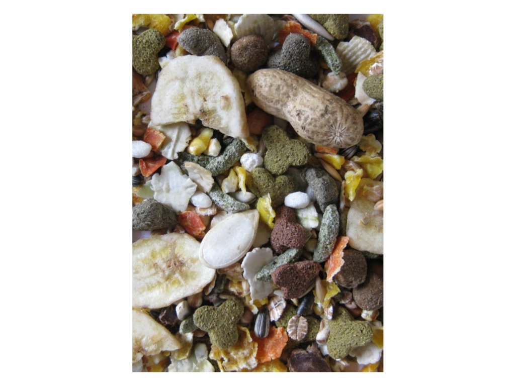 Zusammensetzung: Getreide (1% Hirse), pflanzliche Nebenerzeugnisse, Gemüse (15,7%), Saaten, Früchte (2% getrocknete Bananen), Nüsse (2% Erdnüsse), Fleisch und tierische Nebenerzeugnisse, Insekten (1,5% Mehlwürmer), Öle und Fette, Mineralstoffe, Hefe.