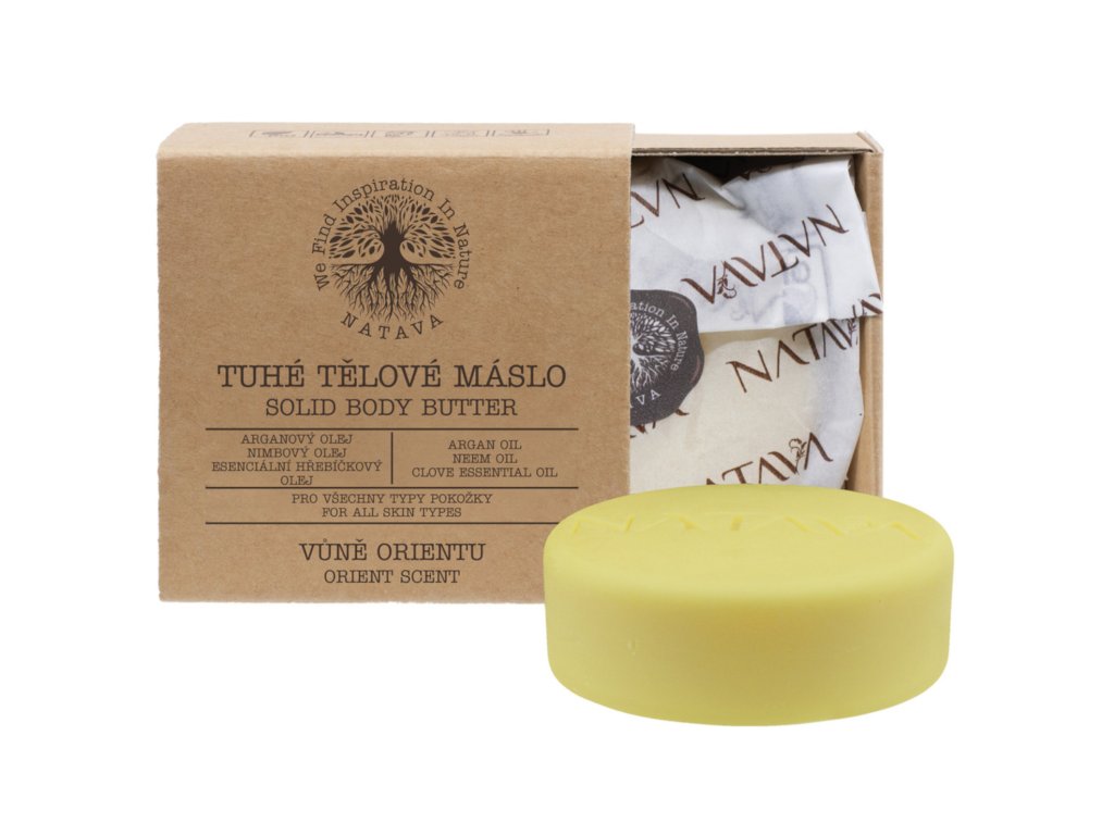 Das Beste aus der Natur in einer festen Körperbutter entführt Sie mit seinem Duft in ferne orientalische Länder. Ihr Geist wird entspannt und Ihre Haut wird perfekt genährt, mit Feuchtigkeit versorgt und angenehm duftend. Die praktische und vor allem ökologische Verpackung enthält viele wertvolle natürliche Inhaltsstoffe, wie beispielsweise Argan-, Neem- oder ätherisches Nelkenöl. Feste Körperbutter, mit maximalem Respekt für Natur und Umwelt in recycelbaren Papierverpackungen verpackt, enthält reichhaltige natürliche Inhaltsstoffe. Die Basis bilden Kakao- und Sheabutter, die in diesem Fall beispielsweise mit dem betörenden Duft von ätherischem Nelkenöl oder Argan- und Neemöl angereichert werden. Zusammen unterstützen sie die Regeneration, Hydratisierung und Tiefenpflege der Haut. Die zarten Buttern von NATAVA sind Balsam für Körper und Seele. Gönnen Sie sich Momente der Entspannung und Ruhe, haben Sie eine schöne und hydratisierte Haut und haben Sie gleichzeitig das gute Gefühl, dass Sie mit der Verwendung der festen Butter der tschechischen Kosmetikmarke NATAVA zum Erhalt der Artenvielfalt beitragen und die Umwelt nicht mit Plastikverpackungen belasten. Anwendung: Die Butter lässt sich ganz einfach in den Händen erwärmen und auf der Haut verteilen. Es kann auch für eine sanfte Ganzkörpermassage verwendet werden. Tragen Sie die Butter nach Bedarf auf die trockene und saubere Haut auf. Die feuchtigkeitsspendende Wirkung ist effektiver, wenn Sie es direkt nach dem Baden oder Duschen auftragen. Für bequemeres Reisen mit Ihrer Lieblingsbutter finden Sie in unserem Sortiment ein speziell entwickeltes Aluminiumetui, das leicht ist und in das die feste NATAVA Körperbutter perfekt hineinpasst.Nährwerte