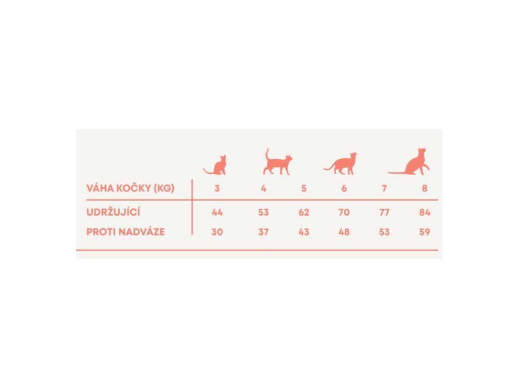 Fütterungshinweis:Die Futterumstellung sollte schrittweise über einen Zeitraum von 7 Tagen erfolgen. Orientieren Sie sich an der Dosierungstabelle. Die tägliche Futtermenge kann bei jeder Katze je nach Aktivitätsniveau, Rasse und Umweltbedingungen unterschiedlich sein. Teilen Sie das Tagesfutter auf 2 Portionen pro Tag auf, verwenden Sie keine Futterreste vom Vortag. Die Katze muss immer Zugang zu sauberem, frischem Wasser haben. Lagerung: Kühl und trocken lagern. Die Verpackung sollte nach Gebrauch stets wieder fest verschlossen werden.