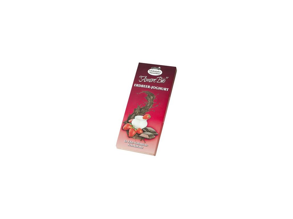 Köstliche Milchschokolade gefüllt mit Erdbeer-Joghurt-Creme, mit Stücken gefriergetrockneter Erdbeeren. Die Schokolade wird aus hochwertigen Bio-Zutaten hergestellt.