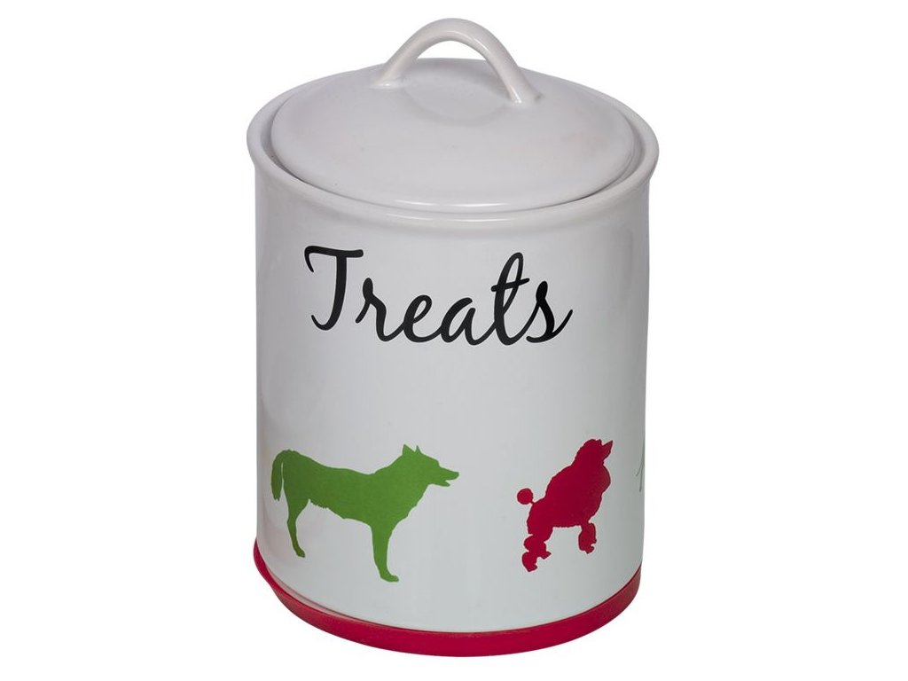 Hochwertige Keramikdose für Trockenfutter. Im Behälter bleiben die Leckereien trocken, frisch und lichtgeschützt. Am Boden des Gefäßes befindet sich ein abnehmbarer Silikonring, der für einen sicheren Stand auf glatten Oberflächen sorgt. Größe ø 15,5 x 21,5 cm. Farbe: weiß mit Aufdruck.Zusätzliche Parameter
