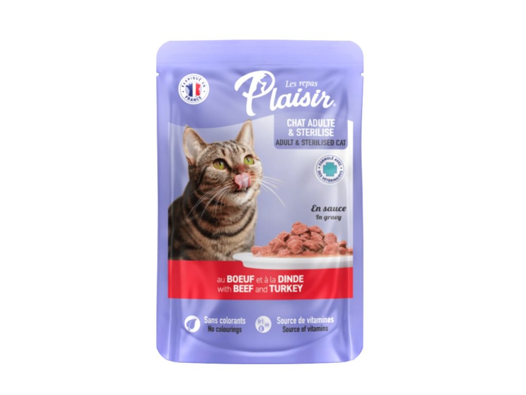 Vollständiges Nassfutter für erwachsene Katzen. Saftige Fleischtasche mit Rind und Pute.