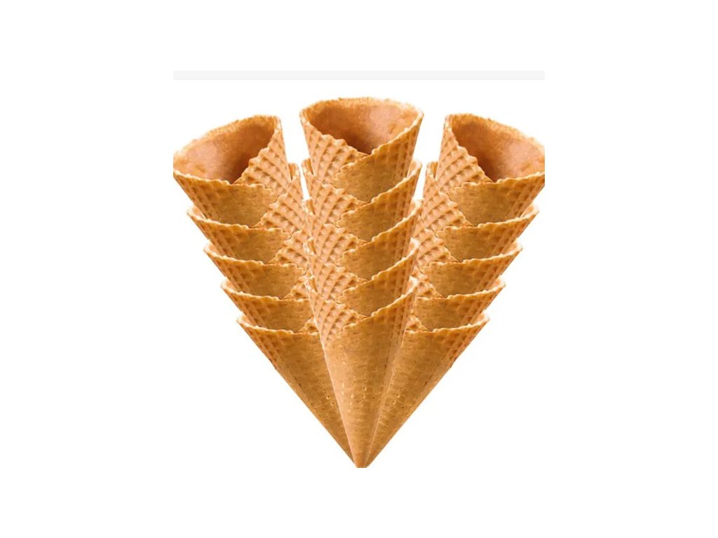 Gedrehte knusprige Waffeltüte ohne Rand für 2-3 Kugeln, zum Verkauf von Eis. Der Kegel ist ca. 140 mm lang und hat einen Außendurchmesser von 54 mm.