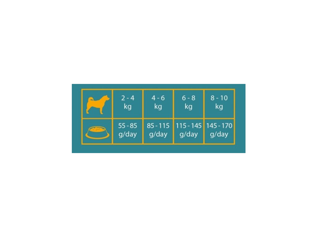 Zusammensetzung: Fleisch und tierische Nebenerzeugnisse (Geflügel 26 %, frisches Hähnchen 10 %), Getreide (Reis 5 %), Öle und Fette, pflanzliche Nebenerzeugnisse, Fisch und Fischnebenerzeugnisse, Mineralstoffe, Früchte (Äpfel 1.000 mg/kg und Heidelbeeren 1.000 mg/kg), Hefe (500 mg/kg).