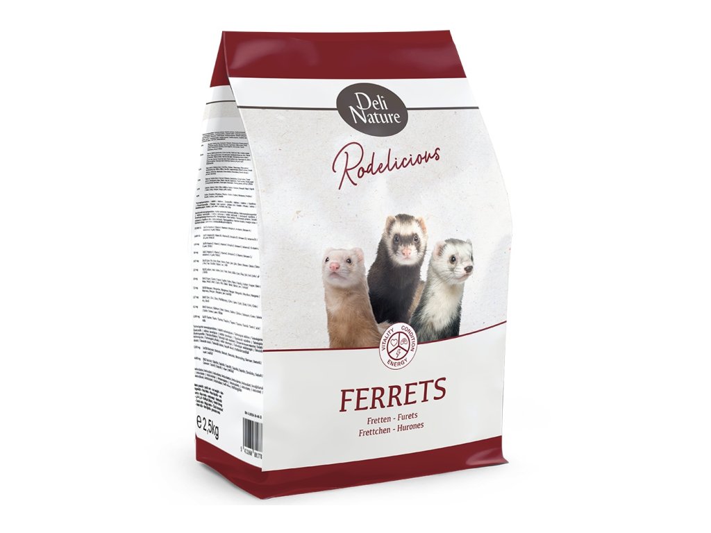 Deli Nature Ferrets je vyvážené krmivo bez obilovin, lepku a laktózy přizpůsobené nutričním potřebám aktivních dospělých fretek a přispívá k extra vitalitě, energii a optimální kondici.