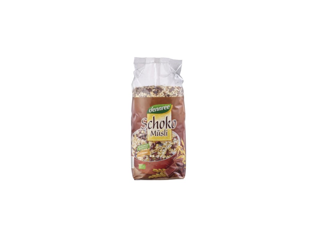 Dennree čokoládové müsli je ideální směs pro fajnšmekry, kteří mají rádi čokoládovou odrůdu v misce müsli. Vydatné celozrnné vločky z pšenice a ovsa jsou sladěny s kousky jemné mléčné čokolády. Toto müsli, rafinované čokoládovými křupavými nápoji, nabízí obzvláště čokoládově křupavý chuťový zážitek. Vychutnejte si plnou chuť čokolády.