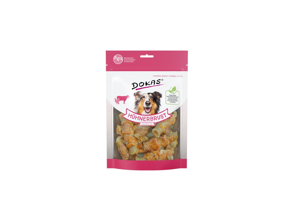 Krátké rolky z hovězí kůže obaleném masem z kuřecích prsou. Jejich žvýkání pomáhá udržovat zdravé zuby a dásně. Vysoká kvalita použitých surovin zaručuje výraznou chuť a vůni. Jsou velmi oblíbené pro své přírodní složení. Pamlsky Dokas jsou bez konzervantů, umělých barviv, dochucovadel a glycerinu. Sáček má praktické uzavírání, pamlsky tak zůstanou déle čerstvé a voňavé. Složení: hovězí kůže 75%, filet z kuřecích prsou 23%, vedlejší rostlinné produkty, minerální látky Analýza: hrubé bílkoviny 89,5%, hrubé oleje a tuky 3%, hrubé popeloviny 2%, hrubá vláknina 0,5%, vlhkost 12% Podávejte jako odměnu. Zajistěte dostatek pitné vody. Po otevření pečlivě uzavřete zipem a skladujte v suchu a chladu. Balení obsahuje kyslíkový absorbér pro uchování kvality výrobku. Pamlsky jsou v dnešní době nedílnou součástí krmení mazlíčků, a tak i u nich je potřeba dbát nejen na chuť, ale i na zdravé složení. U pamlsků Dokas máte jistotu, že všechny použité suroviny splňují přísná kritéria a jsou během výroby pravidelně prověřovány. Psí a kočičí pamlsky Dokas podléhají pravidelným kontrolám kvality světově uznávaným německým institutem SGS Institut Fresenius. Tato nezávislá laboratoř patří mezi přední evropské společnosti testující kvalitu potravin.Doplňkové parametry