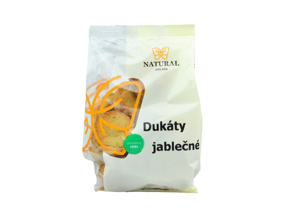 Dukáty jablečné - Natural Jihlava 200g jsou chutné a výživné sušenky připravené z vybraných ingrediencí. Jsou ideální jako zdravá svačina, rychlá energie během dne nebo sladká tečka po jídle. Přidejte si je do svého dne a dopřejte si vyváženou kombinaci chuti a energie.