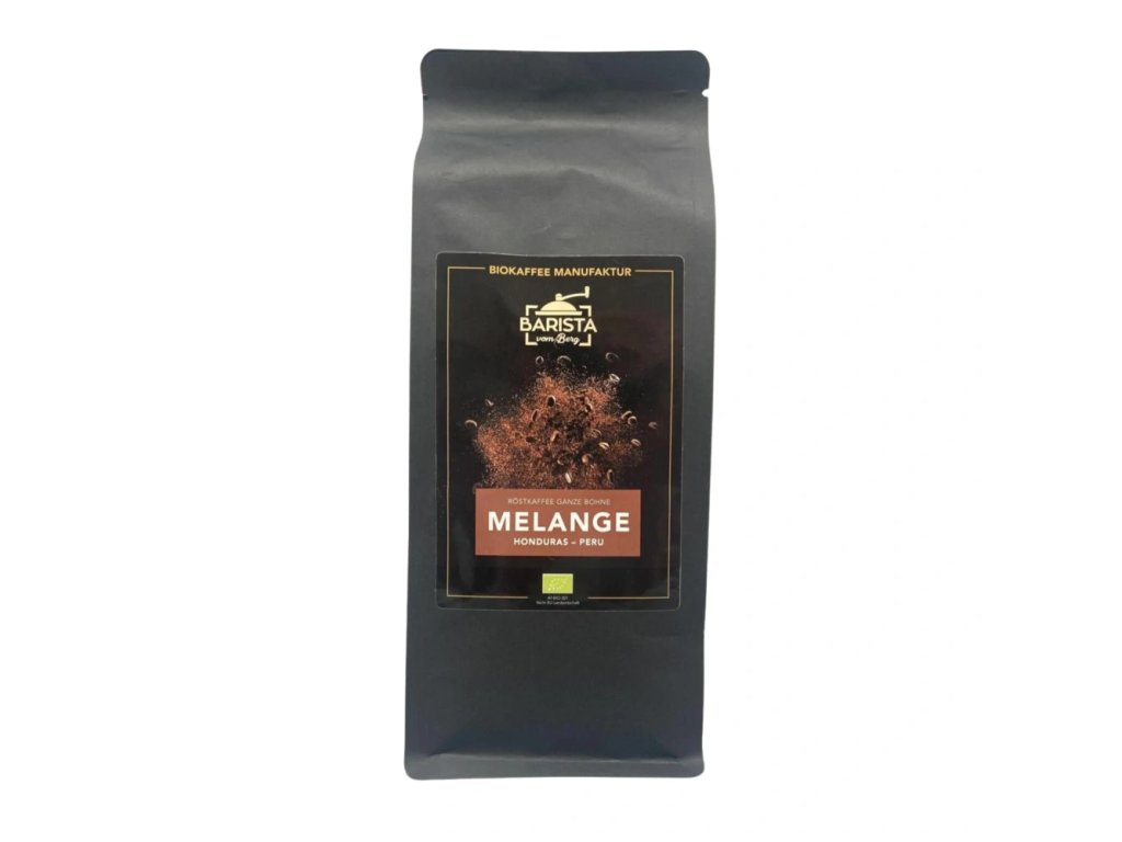Melange is a blend of 100% Arabica beans from Peru and Honduras, which are mixed in a 50/50 ratio. The medium roasting of these beans creates an aromatic flavor profile with aromas of chocolate, nuts and fruity notes. Thanks to the gentle and slow roasting, the coffee beans develop their full flavor, which greatly reduces the natural sour taste.