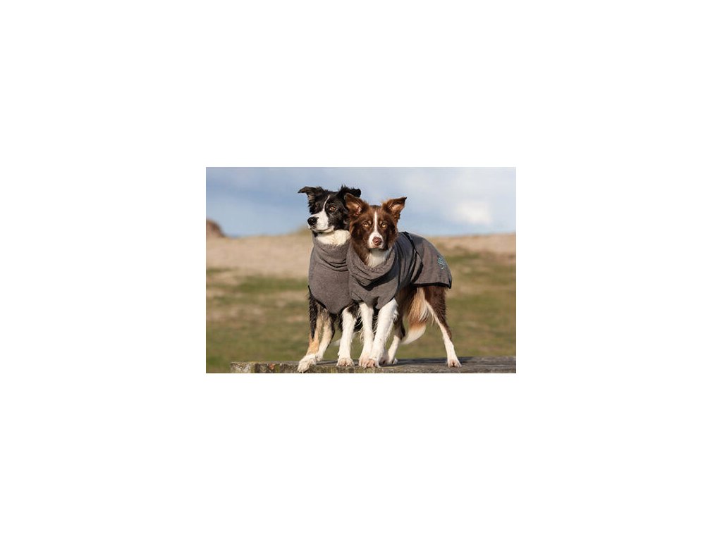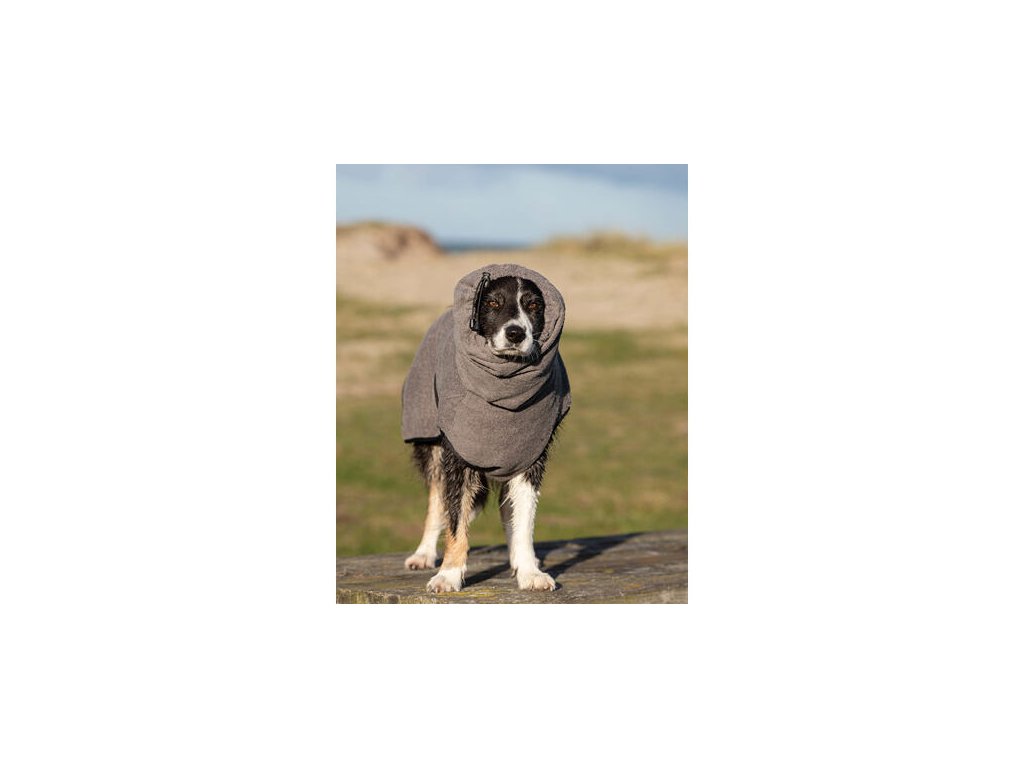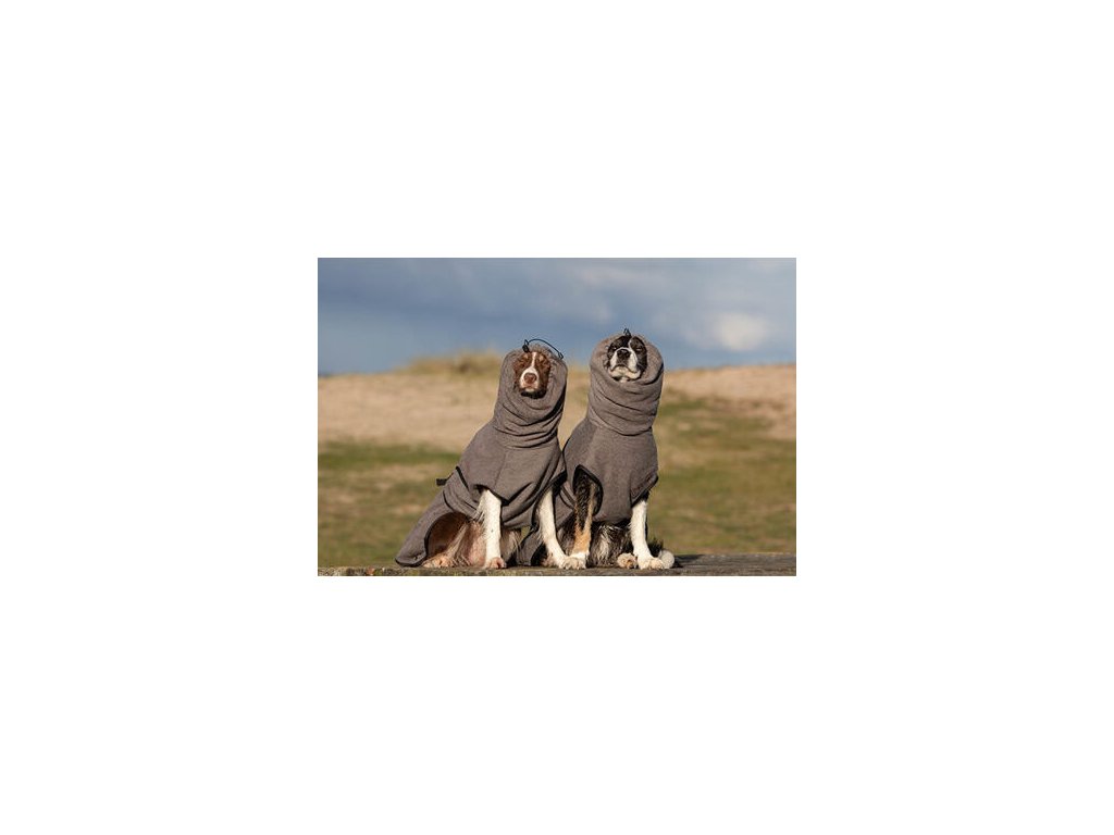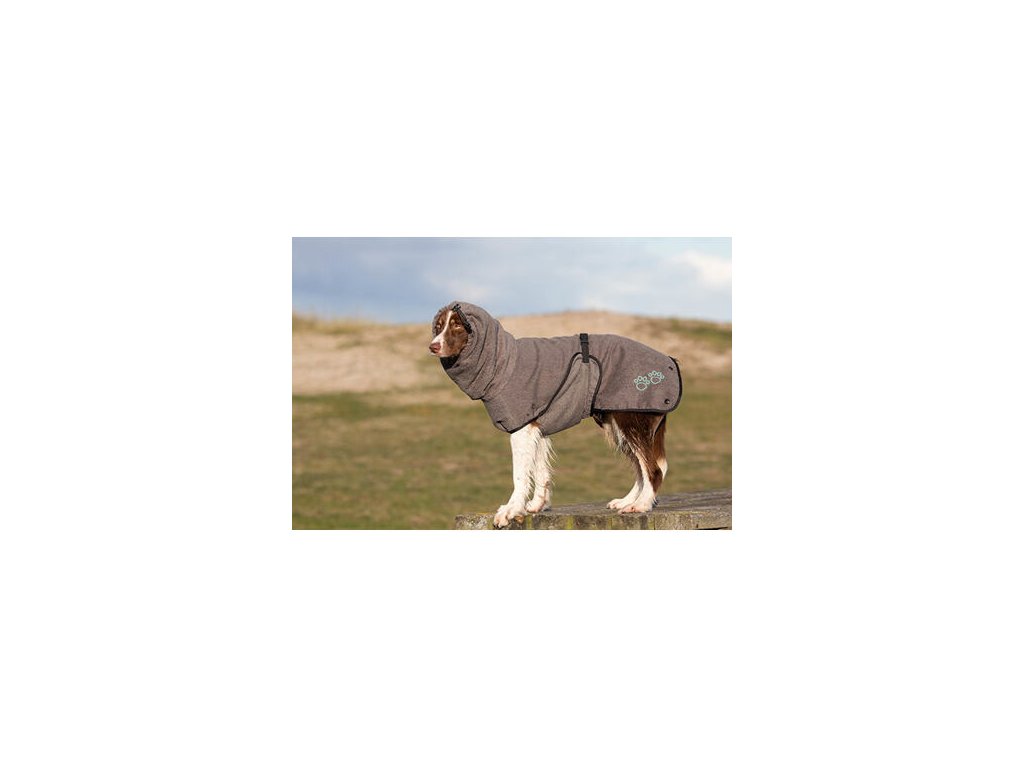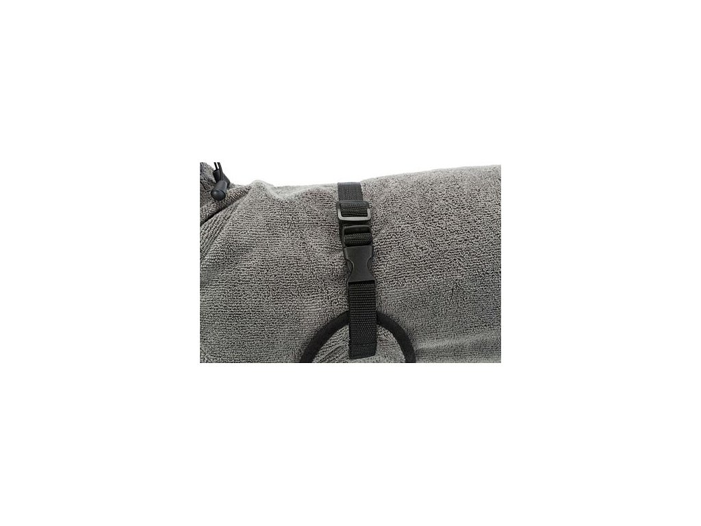 - with snaps in the back so that the bathrobe fits snugly against the dog's coat