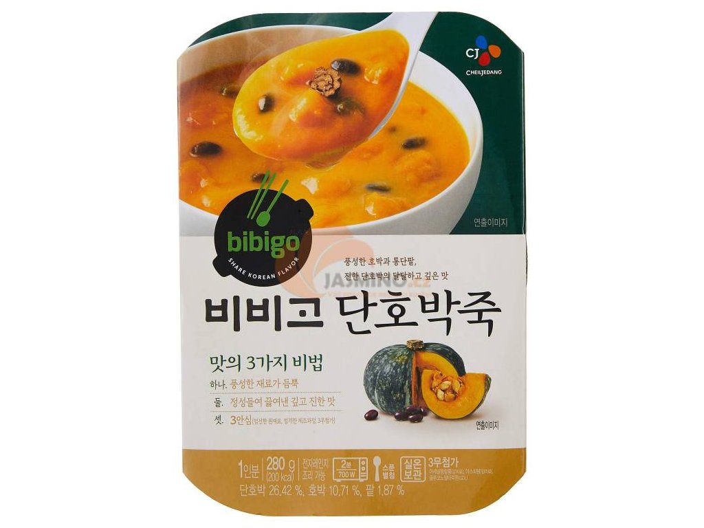 Ingredients: Water, sweet pumpkin 16%, pumpkin 10%, sweet pumpkin pieces 10%, rice powder, sugar, red bean paste (red beans, water, sugar, salt), oligosaccharide, modified corn starch, maltodextrin, salt. Contains: wheat, soy, sesame. Preparation method: Pull the top back to the heating line, place in the microwave and heat for 1 min 30 seconds at 1000 watts. Nutritional values per 100g: Energy 840kJ/ 200kcal / Fat 1g - of which saturated 0g / Carbohydrates 46g - sugar 22g / Protein 2g / Salt 0.53g. Storage: Store in a cool and dry place. Avoid direct sunlight. Store in the refrigerator after opening.. Country of origin: Korea.Additional parameters