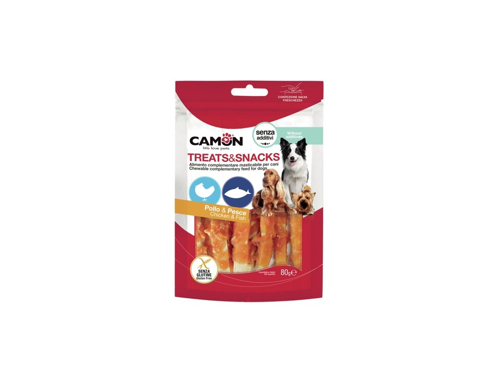 Chicken and cod flavoured treats.COMPLEMENTARY FOOD FOR DOGS - INGREDIENTS: Chicken 48.5%, fish 40% (Atlantic mackerel), corn starch, glycerin, sorbitol, salt.