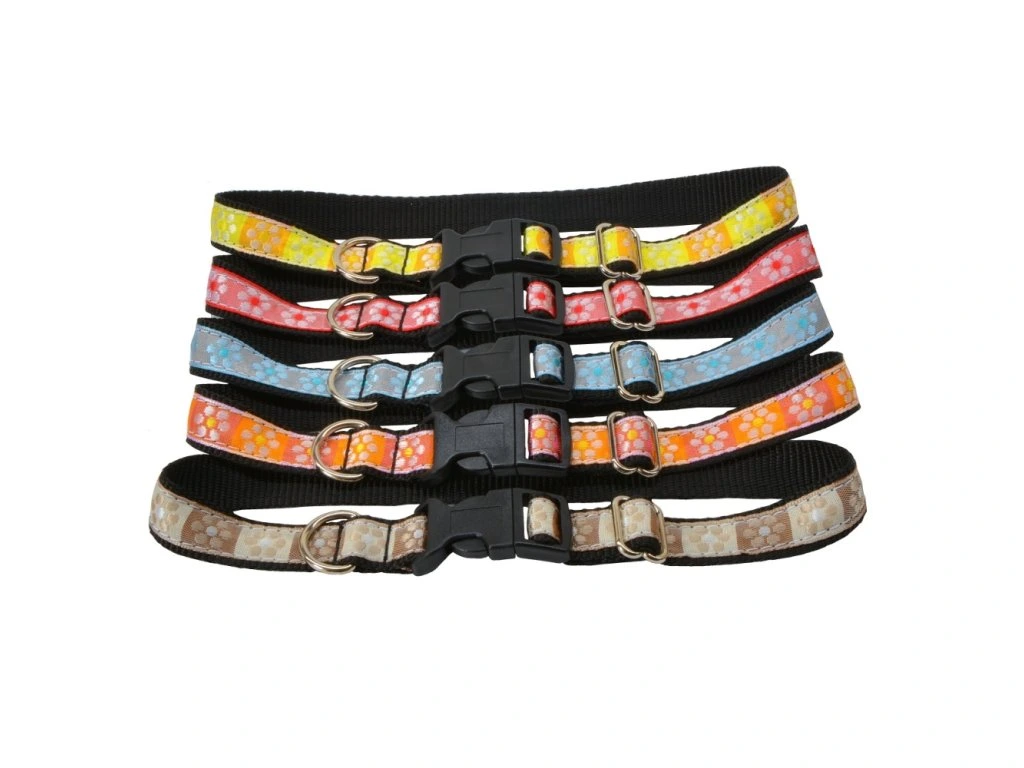 A sturdy and high-quality strap collar. Decorated with a ribbon on the outside with a flower decor.
