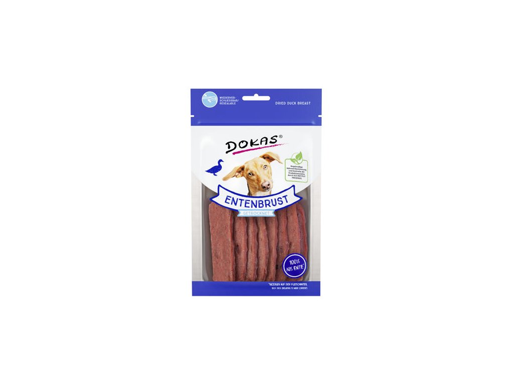 Delicious slices of duck meat for a healthy snack. You can also cut them into small pieces and use them as rewards during training. The high quality of the ingredients used guarantees a distinctive taste and aroma. They are very popular for their natural composition. Dokas treats are free of preservatives, artificial colors, flavorings and glycerin. The bag has a practical closure, so the treats stay fresh and fragrant for longer. Ingredients: duck breast fillet 93%, vegetable by-products, minerals Analysis: crude protein 48.8%, crude oils and fats 3.1%, crude ash 4.4%, crude fiber 0.5%, moisture 17.2% Serve as a reward. Ensure plenty of drinking water. After opening, carefully close the zip and store in a dry and cool place. The package contains an oxygen absorber to preserve the quality of the product. Treats are an integral part of pet feeding these days, so it is necessary to pay attention not only to the taste, but also to the healthy composition. With Dokas treats, you can be sure that all the ingredients used meet strict criteria and are regularly checked during production. Dokas dog and cat treats are subject to regular quality checks by the world-renowned German institute SGS Institut Fresenius. This independent laboratory is one of the leading European companies testing food quality.Additional parameters