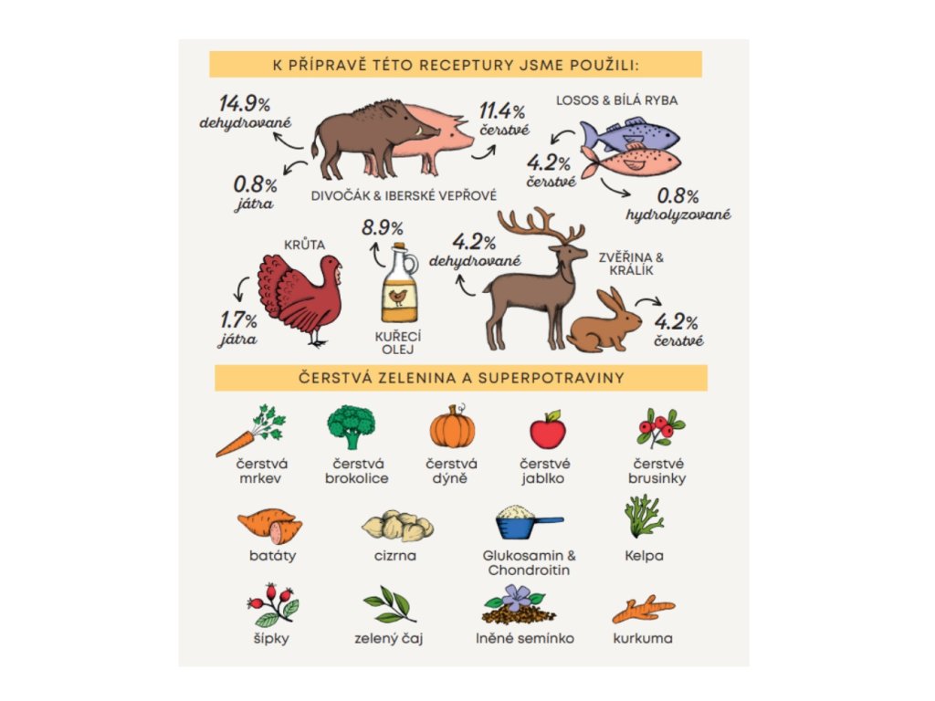 Ingredients: dehydrated Iberian pork 14.9%, dehydrated potatoes, chicken oil (protected with natural tocopherols) 8.9%, whole green peas, fresh deboned pork 7.2%, potato starch, dehydrated venison 4.2%, fresh salmon 4.2%, fresh deboned rabbit 4.2%, fresh deboned wild boar 4.2%, whole chickpeas 4.2%, whole yellow peas 4%, apple fiber, dehydrated sweet potatoes 2.1%, minerals, turkey hydrolysate 1.7%, pork liver hydrolysate 0.8%, fish hydrolysate 0.8%, linseed (natural source of ω3 fatty acids) 0.6%, beet pulp, yeast (Saccharomyces cerevisiae), fresh broccoli 1000 mg/kg, fresh pumpkin 1000 mg/kg, fresh apples 1000 mg/kg, fresh carrots 1000 mg/kg, glucosamine 1000 mg/kg, chondroitin 600 mg/kg, hydrolyzed yeast cell wall (source of MOS) 500 mg/kg, chicory (source of FOS) 500 mg/kg, tangerine extract 400 mg/kg, Yucca schidigera 200 mg/kg, Kelp algae 30 mg/kg, cranberry whole fruit 30 mg/kg, rose hips (rich in vitamin C) 30 mg/kg, green tea 30 mg/kg, turmeric 30 mg/kg.