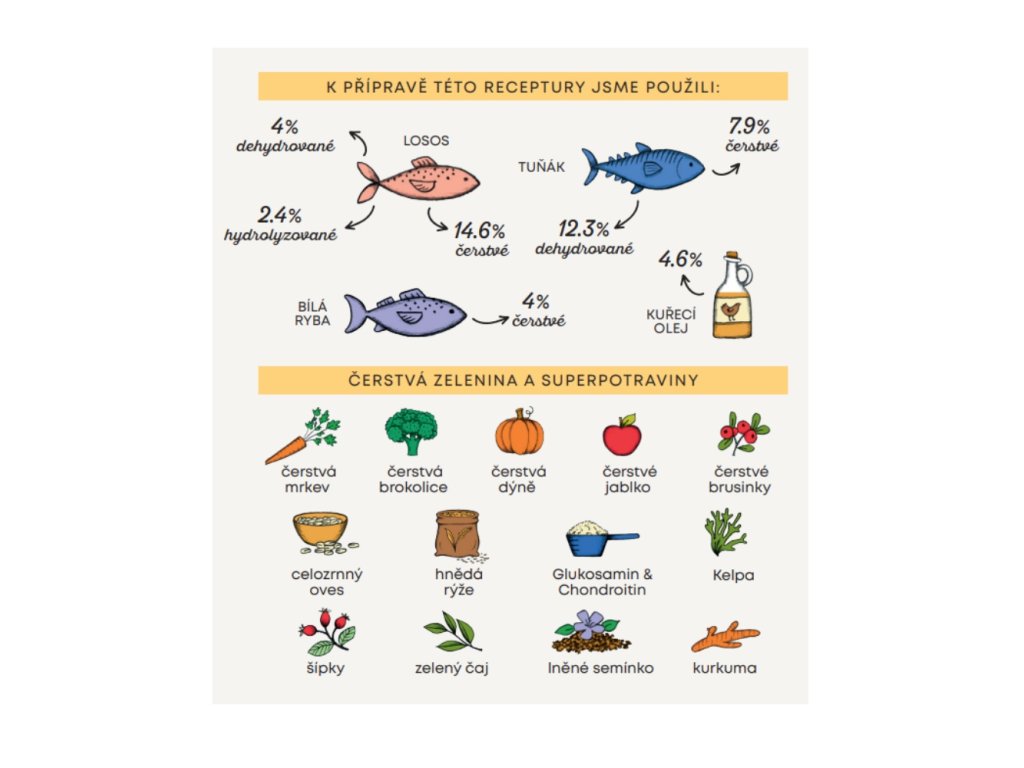Ingredients: fresh salmon 14.6%, extruded rice, dehydrated tuna 12.3%, whole green peas, fresh tuna 7.9%, whole grain rice 7.9%, whole grain barley 6.3%, chicken oil (protected with natural tocopherols) 4.6%, dehydrated salmon 4%, fresh white fish 4%, whole grain oats 3.5%, rice protein, salmon hydrolysate 2.4%, flaxseed (natural source of ω3 fatty acids) 0.5%, beet pulp, apple fiber, yeast (Saccharomyces cerevisiae), minerals, fresh broccoli 1000 mg/kg, fresh pumpkin 1000 mg/kg, fresh apples 1000 mg/kg, fresh carrots 1000 mg/kg, glucosamine 1000 mg/kg, chondroitin 600 mg/kg, hydrolyzed yeast cell wall (source of MOS) 500 mg/kg, chicory (source of FOS) 500 mg/kg, tangerine extract 500 mg/kg, Yucca schidigera 200 mg/kg, Kelp algae 30 mg/kg, cranberry whole fruit 30 mg/kg, rose hips (rich in vitamin C) 30 mg/kg, green tea 30 mg/kg, turmeric 30 mg/kg.
