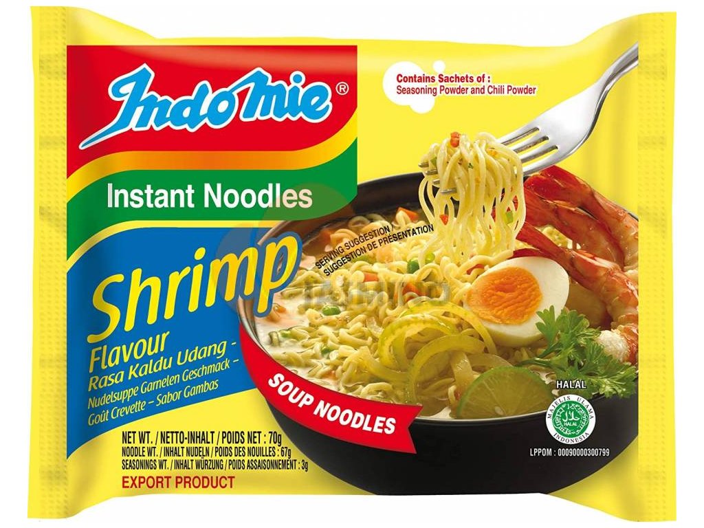 - Ingredients: Noodles: wheat flour 74%, refined palm oil (contains antioxidant E319), tapioca starch, salt, acidity regulator (E451, E501, E500), thickener (E412), colorant (E101). Seasoning powder: salt, flavor enhancers (E621, E627, E631), sugar, garlic, flavor 2%, yeast extract, coriander, paprika, artificial chicken flavor, garlic, chili powder, pepper powder. Allergens wheat, nuts, soy and eggs Nutritional values per 100g Energy 426kJ / 102 kcal / Fat 3.3g of which saturated fatty acids 1.4g m / Carbohydrates 15.3g of which sugar 0.8g / Protein 2.5g / Salt 0.9g. Storage: Store in a dry place and protect from sunlight. Country of origin: Indonesia.Additional parameters