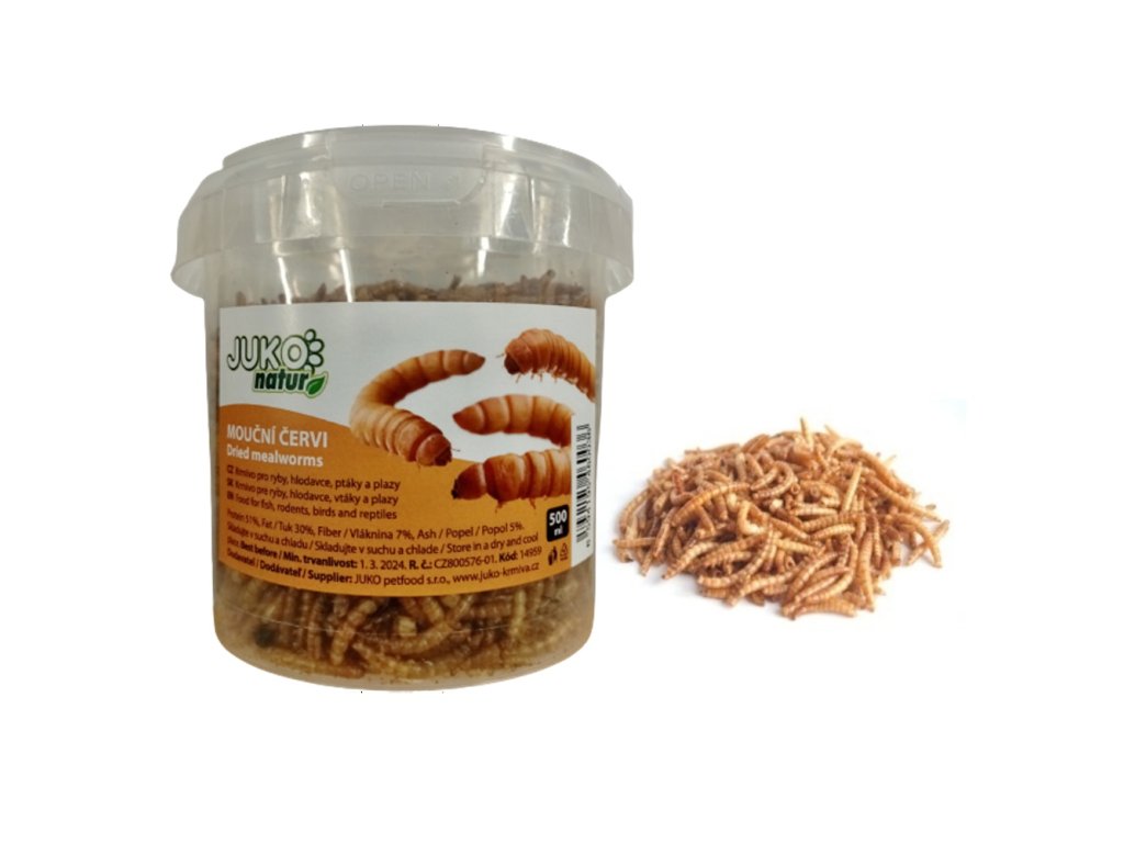 Dried mealworm larvae are a 100% natural supplementary food for birds, fish, lizards, iguanas, turtles, frogs, hedgehogs, hamsters, mice, rats and other small mammals, cats and dogs.