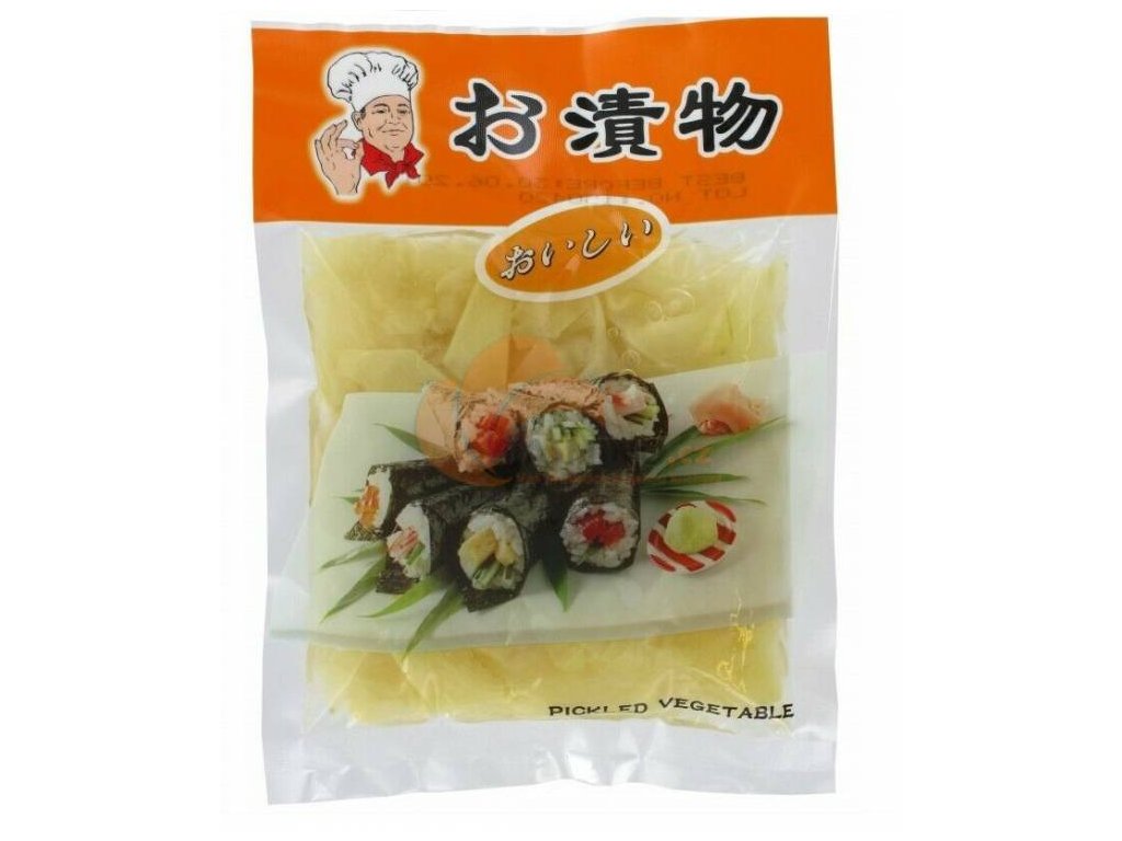- Ingredients: Ginger, water, salt, regulator E260, E330, preservative E202, sweetener E950, E951, E954, E955, monosodium glutamate E621. Nutritional values per 100g: Energy 40 kJ / 10 kcal, Fat 0g of which saturated fatty acids 0g, Carbohydrates 1.3g of which sugar 0g, Protein 0.2g / Salt 2g. Storage: Store in a dry and dark place. Country of origin: China.Additional parameters