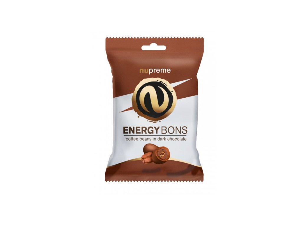 Each Energy Bons pack contains 7g of whole coffee beans, which is a full-fledged alternative to 1-2 cups of coffee. The finely roasted beans of the Tupinamba Supremo blend (70% Arabica from Brazil and 30% Robusta from Vietnam) are coated in delicious chocolate with a very low sugar content. They are an energy bomb suitable for the office, on the go or before training. ENERGY BONS Dark 70 g NUPREME - are a combination of premium coffee and selected dark chocolate with low sugar content - Low sugar content, much less than one cube per entire package - Premium 100% Arabica with full coffee flavor - One package contains 7g of whole coffee beans, which is a full-fledged alternative to 1-2 cups of coffee - They support alertness and provide energy at work or sports - An ideal snack in the car, office or for everyday activities - Almost "sugar-free" chocolate will delight even those who are careful about their calorie intake - No sucralose is used in the sweetening, which prevents many health risks - Hypoallergenic and clean food: no soy, no gluten, peanuts, palm fat or genetically modified ingredientsNutritional values