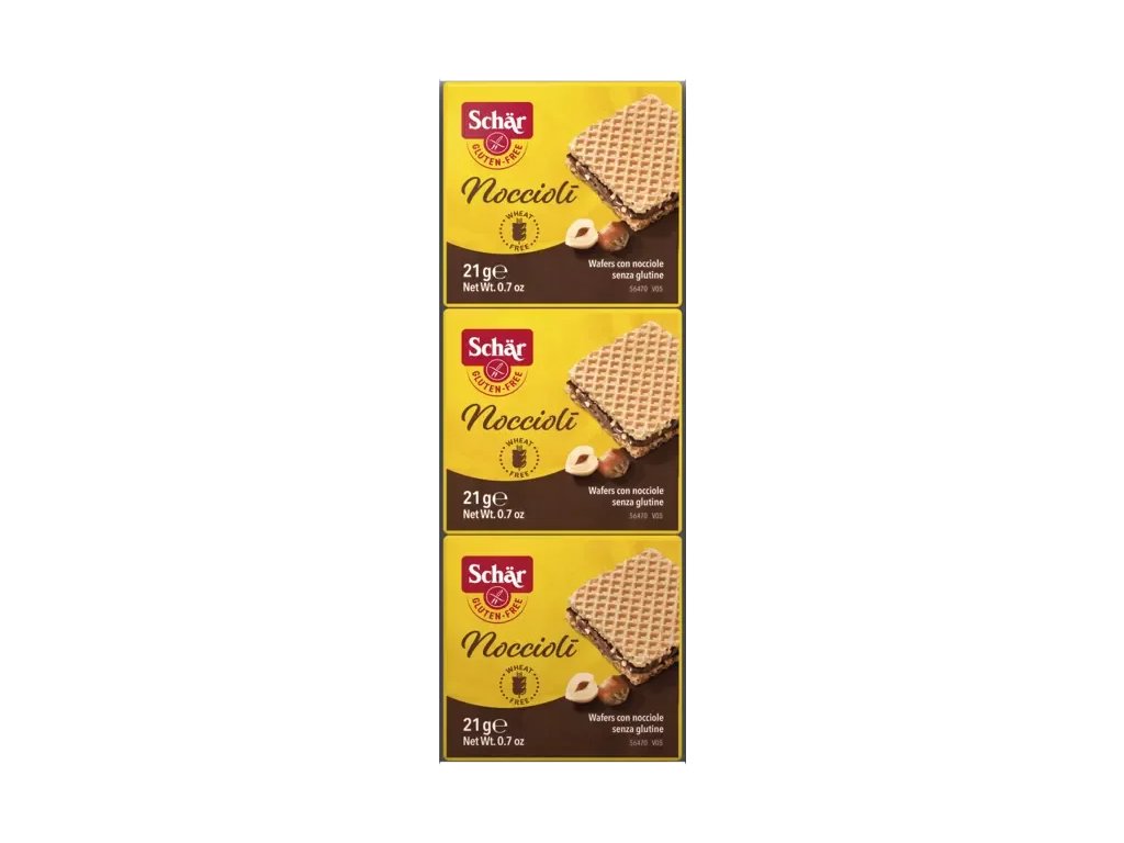Two crispy waffles with hazelnut cocoa cream filling in the middle. Schär's Noccioli is a gluten-free highlight.