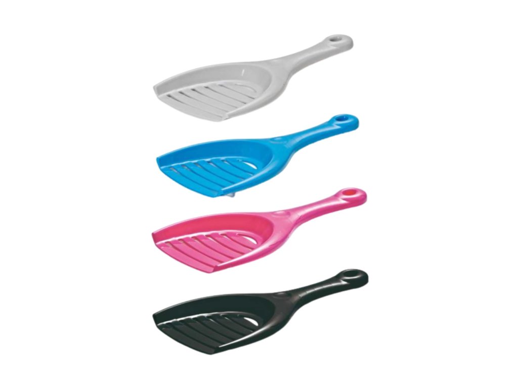 Practical perforated scoop for easy separation of excrement from litter. Hole on the handle for hanging.