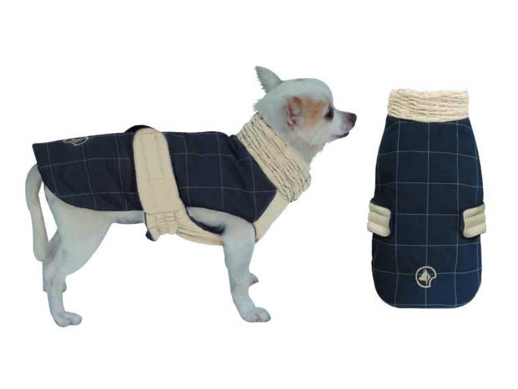 The jacket is secured in place with rubber loops for the back legs.