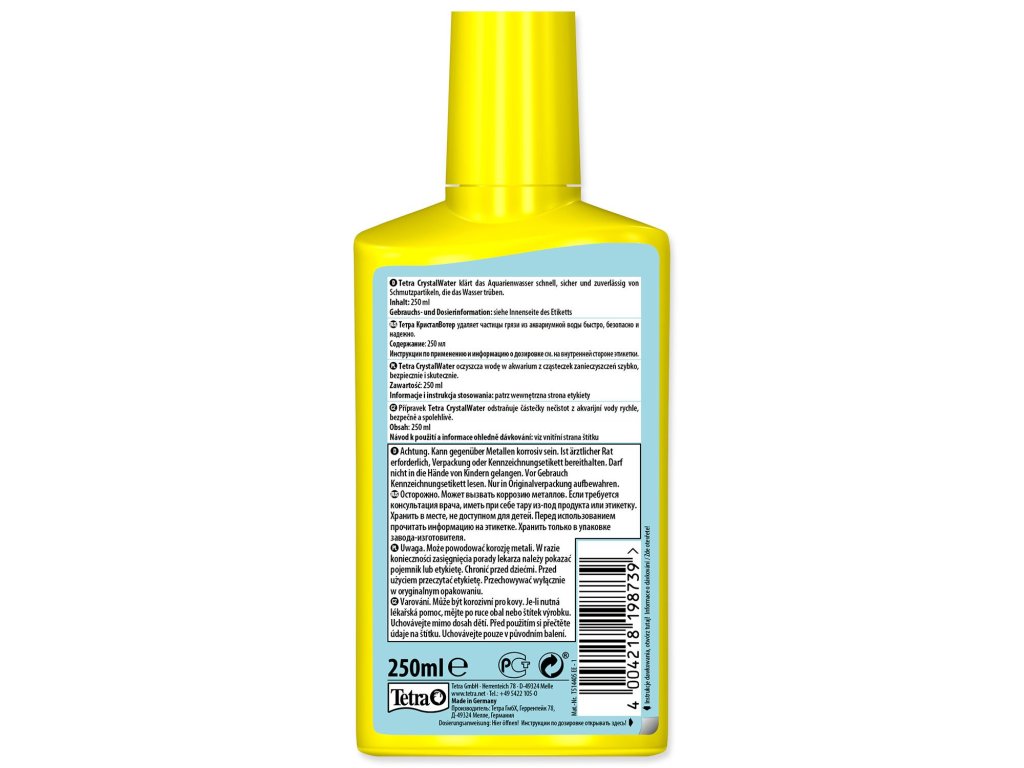 Cleans aquarium water quickly and effectively from floating impurities that cloud the water and leaves it crystal clear. Fish and plants can feel good. CrystalWater binds small impurities in the water to larger parts, which can then be removed by filtration. You can observe the first visible changes after 2-3 hours of exposure, after 6-8 hours of exposure the water is clear and after 6-12 hours crystal clear. Dosage: apply 5 ml per 10 l of aquarium water (2.5 ml per 10 l if the KH value is 1 and lower). Use after each water change, if necessary, if there are visible impurities in the water. There should be a time gap of at least 48 hours between two uses.