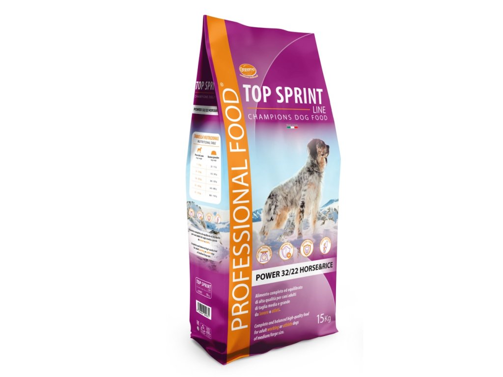 Top Sprint Power Horse & Rice is recommended for dogs that need a high concentration of proteins and fats, which allow them to improve endurance and fight muscle fatigue.