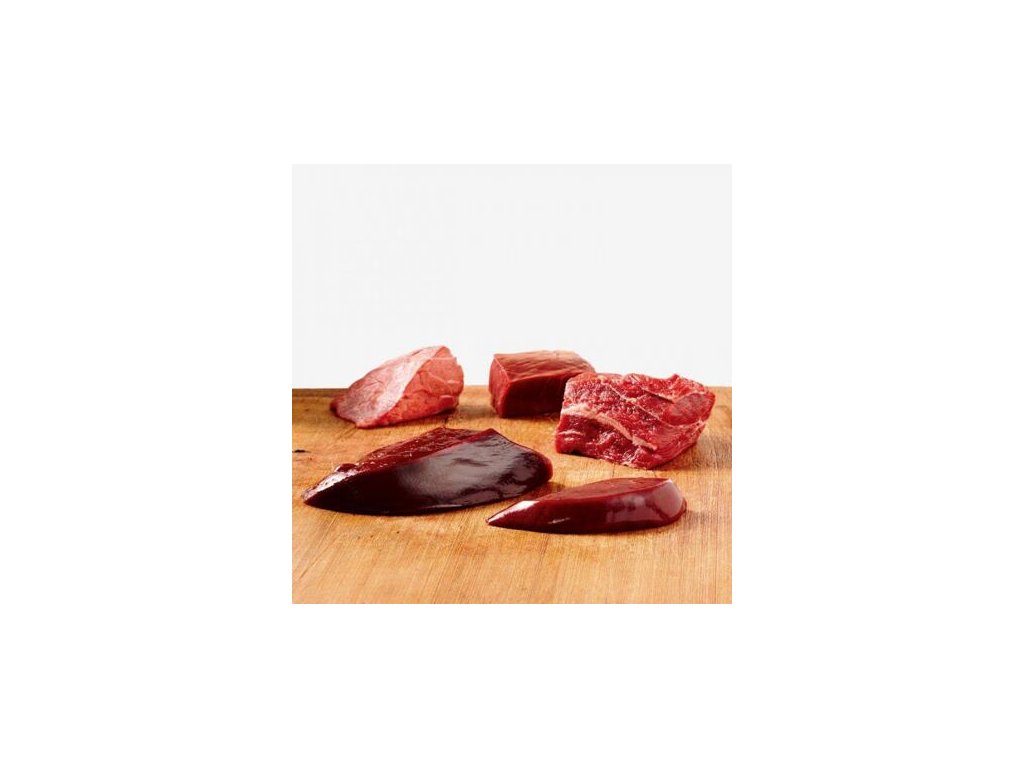 Složení: 41 % hovězí maso (srdce, maso, játra, vemeno, ledviny), 29 % hovězí vývar, 27 % jehněčí (plíce, bachor, játra), minerální látky, světlicový olej