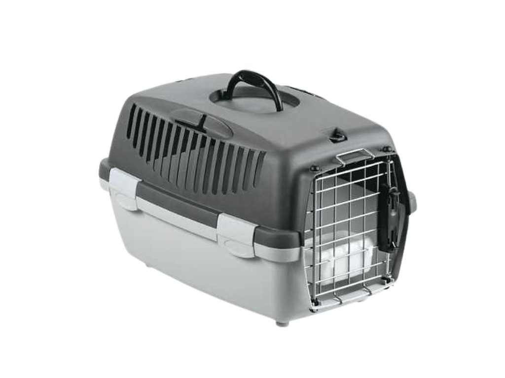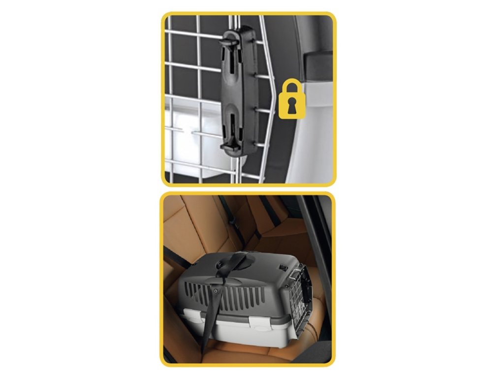 - Vybavena uzamykacím systémem, madlem pro přenášení a nádobkou na vodu nebo krmivo