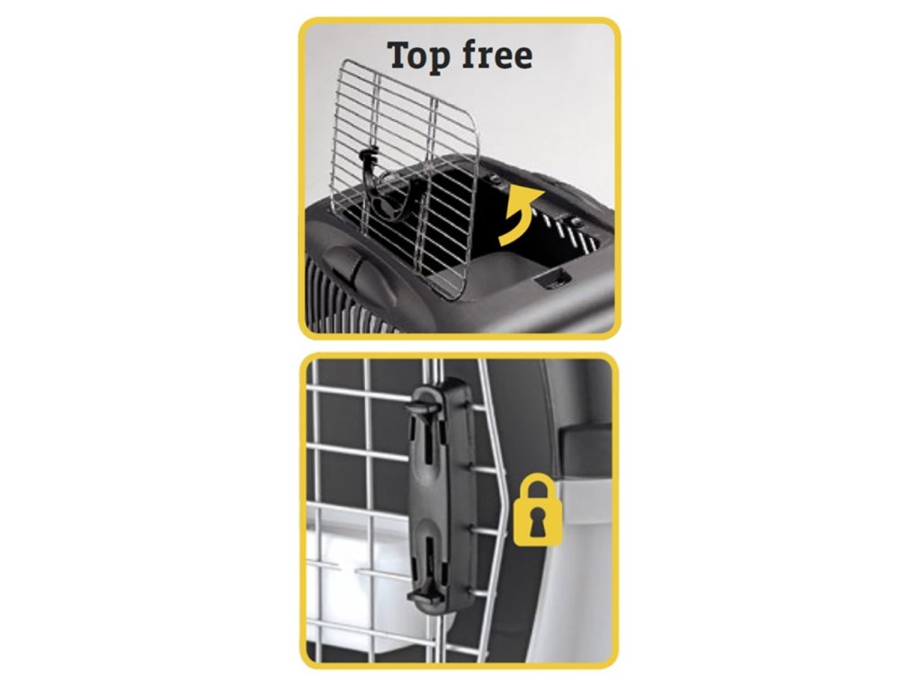 Velice kvalitní plastová přepravka s kovovými dvířky. Vybavena navíc praktickou horní mřížkou kterou lze otevřít a zaručit tak lepší provzdušnění nebo pro vložení krmiva či vody bez nutnosti otevřít dvířka.