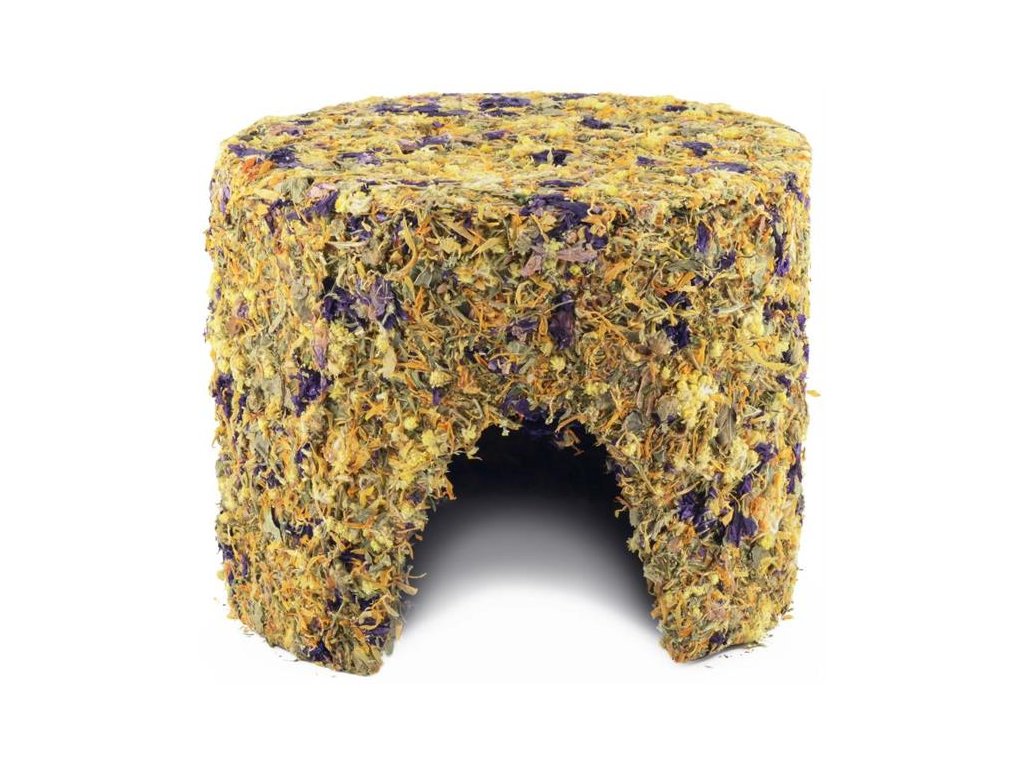 Domek z celulózy obalený ze všech stran bylinkami a květy. Příjemné ubytování zejména pro osmáky, morčata, křečky a další drobné savce na dobu, než neodolatelný domek sežerou.
