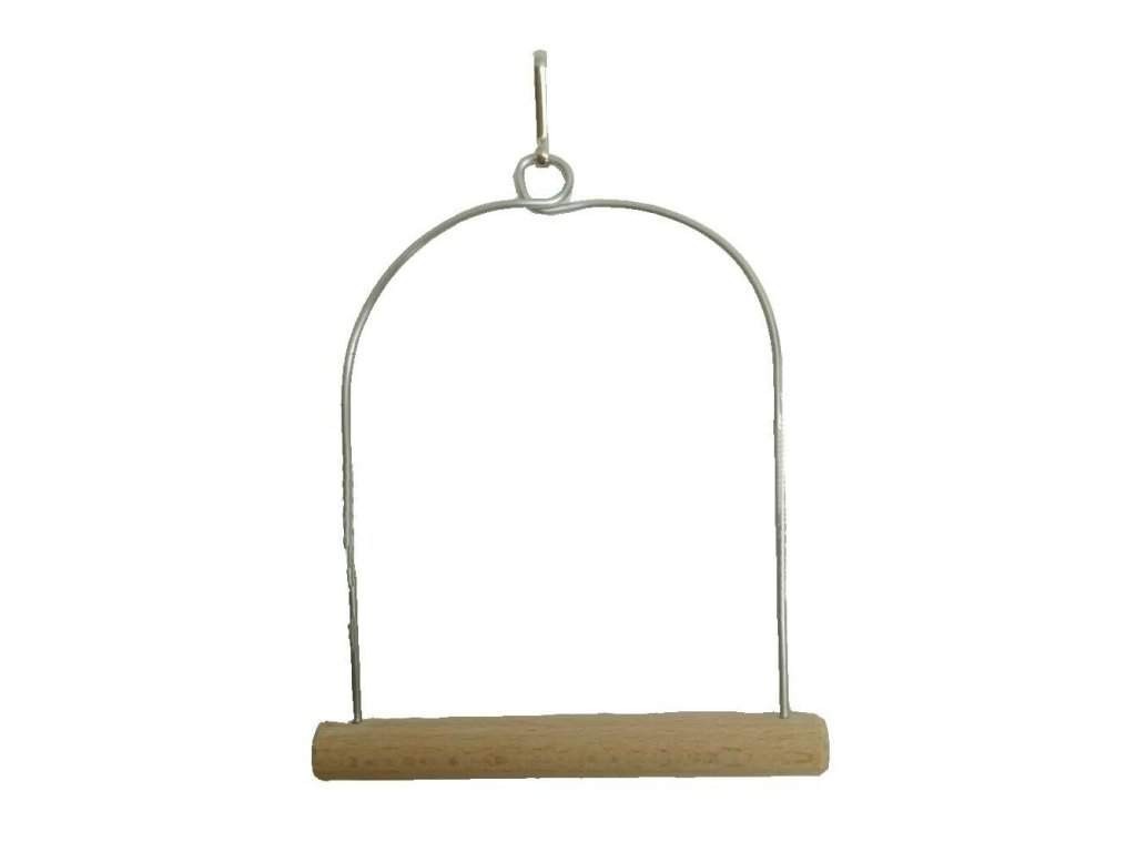 Dřevěná houpačka s rovným bidýlkem a závěsem. Očko houpačky je vytvořeno zkřížením nosného drátu a doplněno o karabinu.