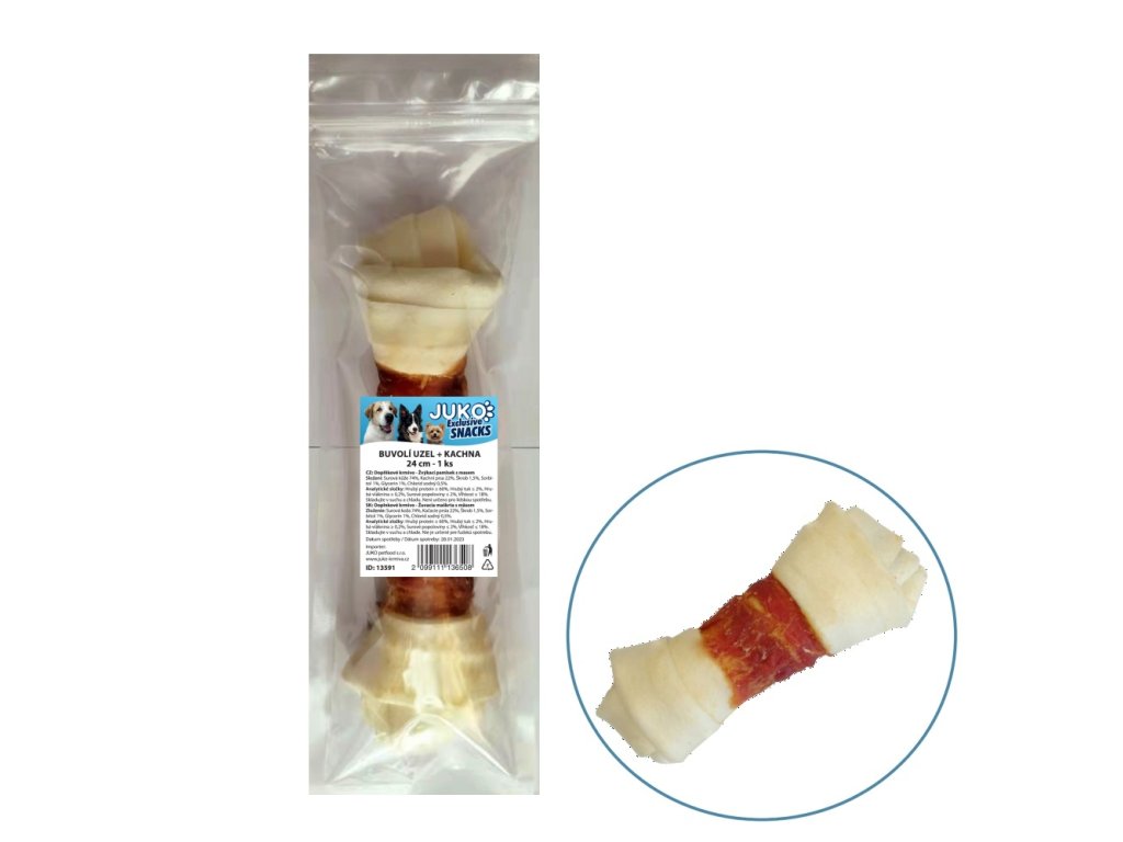Nagyszerű csomó alakú csemege, amely kielégíti a természetes rágási vágyat és szükségletet. A csomók strapabíró bivalybőrből készülnek, amely segít a fogak erős és egészséges megőrzésében rágás közben. A szárított kacsahús finom ízt ad.