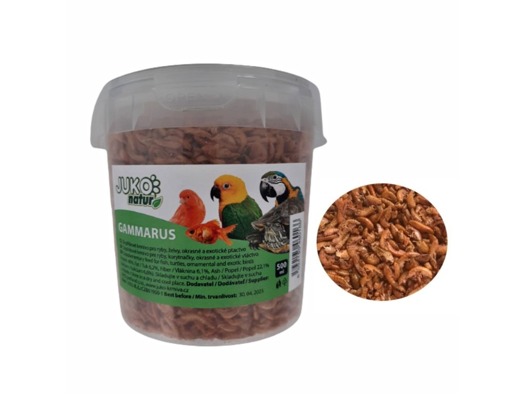Kiegészítő táplálék, szárított gammarus - a rákfélék (bolhafélék) egy fajtája, amely nagyon gazdag fehérjében.