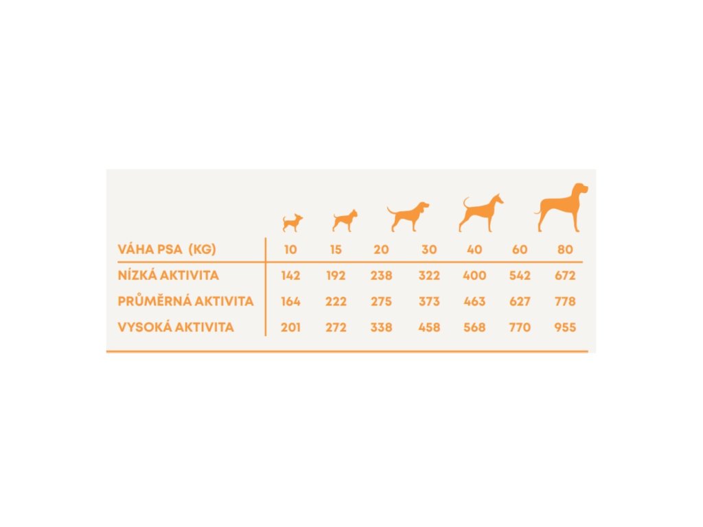 Etetési utasítások:A takarmányozást fokozatosan, 7 napon keresztül kell módosítani. Használja az adagolási táblázatot útmutatóként. A napi táplálék mennyisége kutyánként eltérő lehet, az aktivitási szinttől, fajtától és környezeti feltételektől függően. A napi táplálékadagot lehetőleg napi 2-3 részre kell osztani, mindig ugyanabban az időben. A kutyának mindig hozzá kell férnie tiszta, friss vízhez. Tárolás: hűvös, száraz helyen tárolandó. A csomagolást használat után mindig biztonságosan le kell zárni.